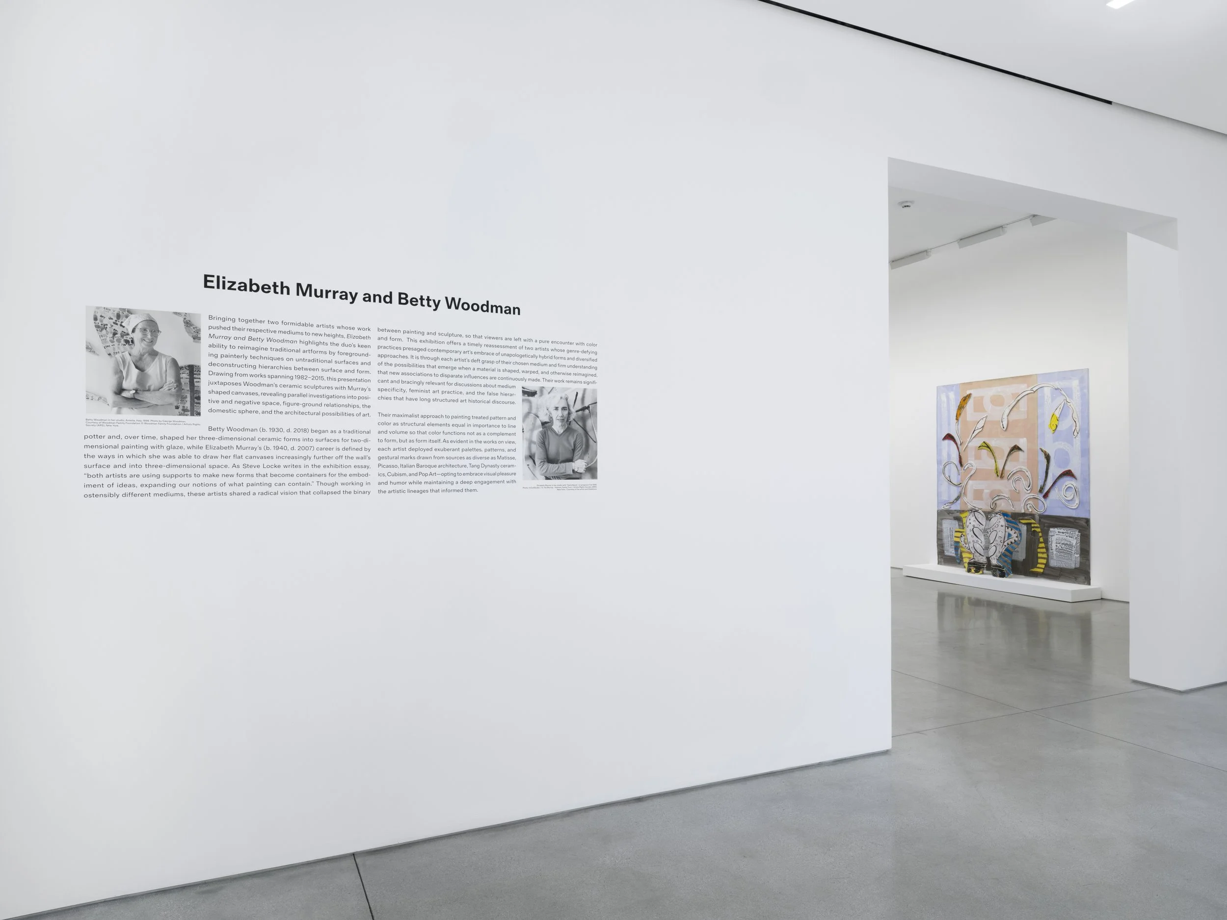 Bringing together two formidable artists whose work pushed their respective mediums to new heights, Elizabeth Murray and Betty Woodman highlights the duo’s keen ability to reimagine traditional art forms by foregrounding painterly techniques on untraditional surfaces and deconstructing hierarchies between surface and form. Though working in ostensibly different mediums—Woodman in ceramics, Murray in painting—these artists shared a radical vision that collapsed the binary between two- and three-dimensional space. In the case of their wall-mounted paintings and sculptures, each artist thoughtfully incorporates the wall as a foundational element that their works can interact with and extend upon. Drawing from a period spanning 1982–2015, this presentation juxtaposes Woodman’s ceramic sculptures with Murray’s shaped canvases, revealing parallel investigations into positive and negative space, figure-ground relationships, the domestic sphere, and the architectural possibilities of art